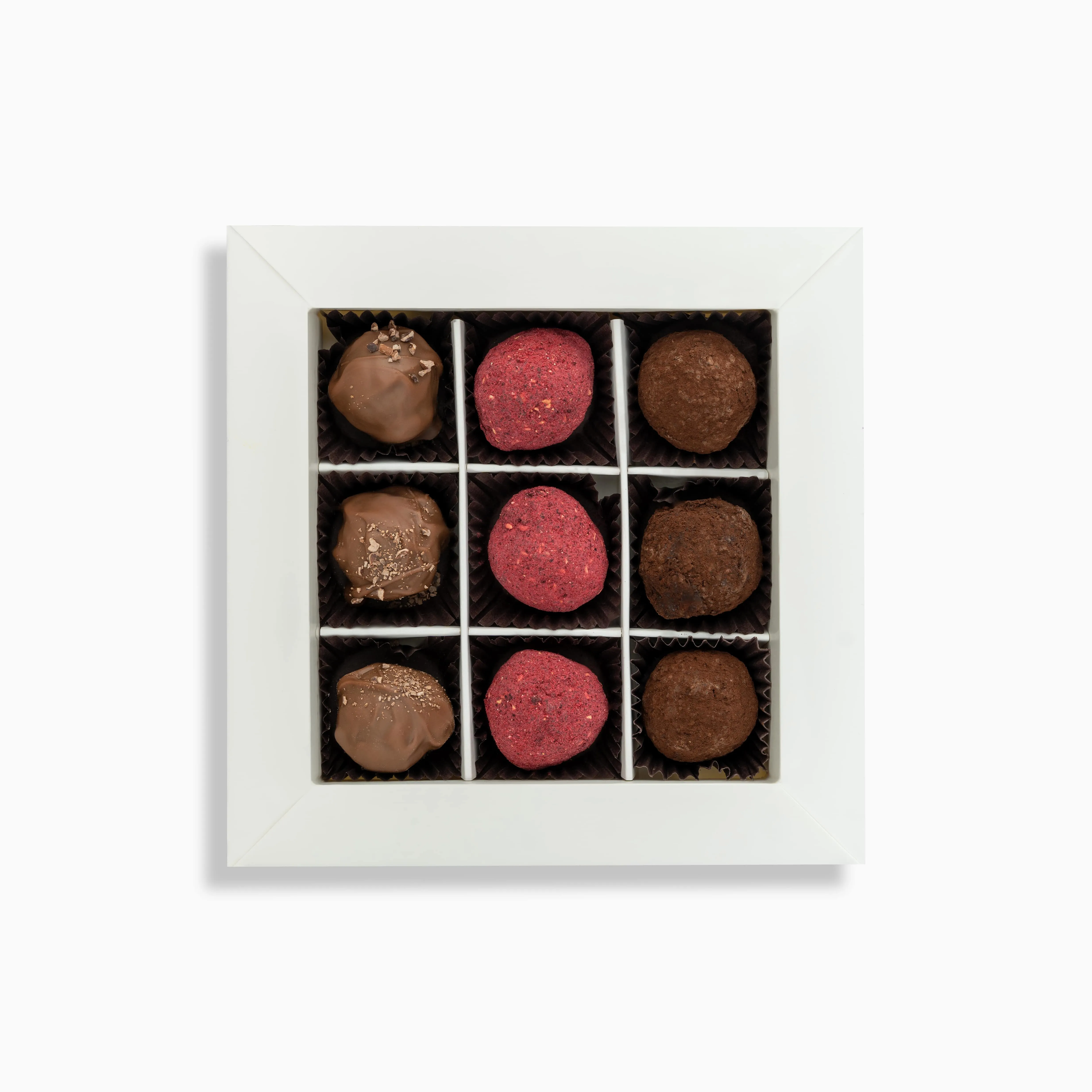 Trufle Marc de Champagne: Intensywne nadzienie o smaku markowego likieru Marc de Champagne, zamknięte w gorzkiej czekoladzie i obtoczone pudrem z malin.