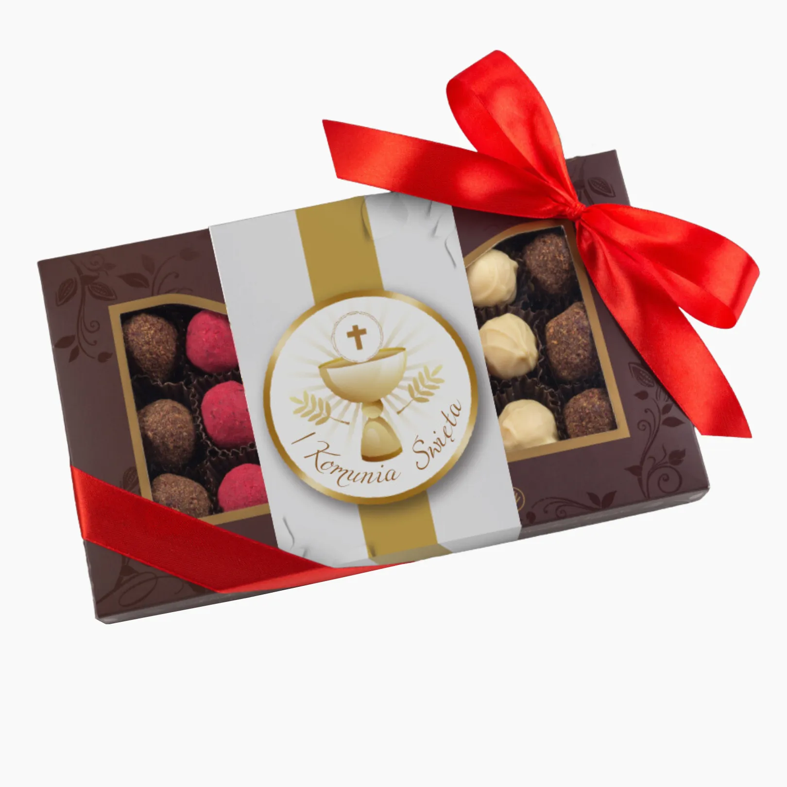 Trufle brandy. Wyśmienite mleczne nadzienie z dodatkiem markowego brandy i prażonym migdałem, wykończone mleczno-kremową białą czekoladą.