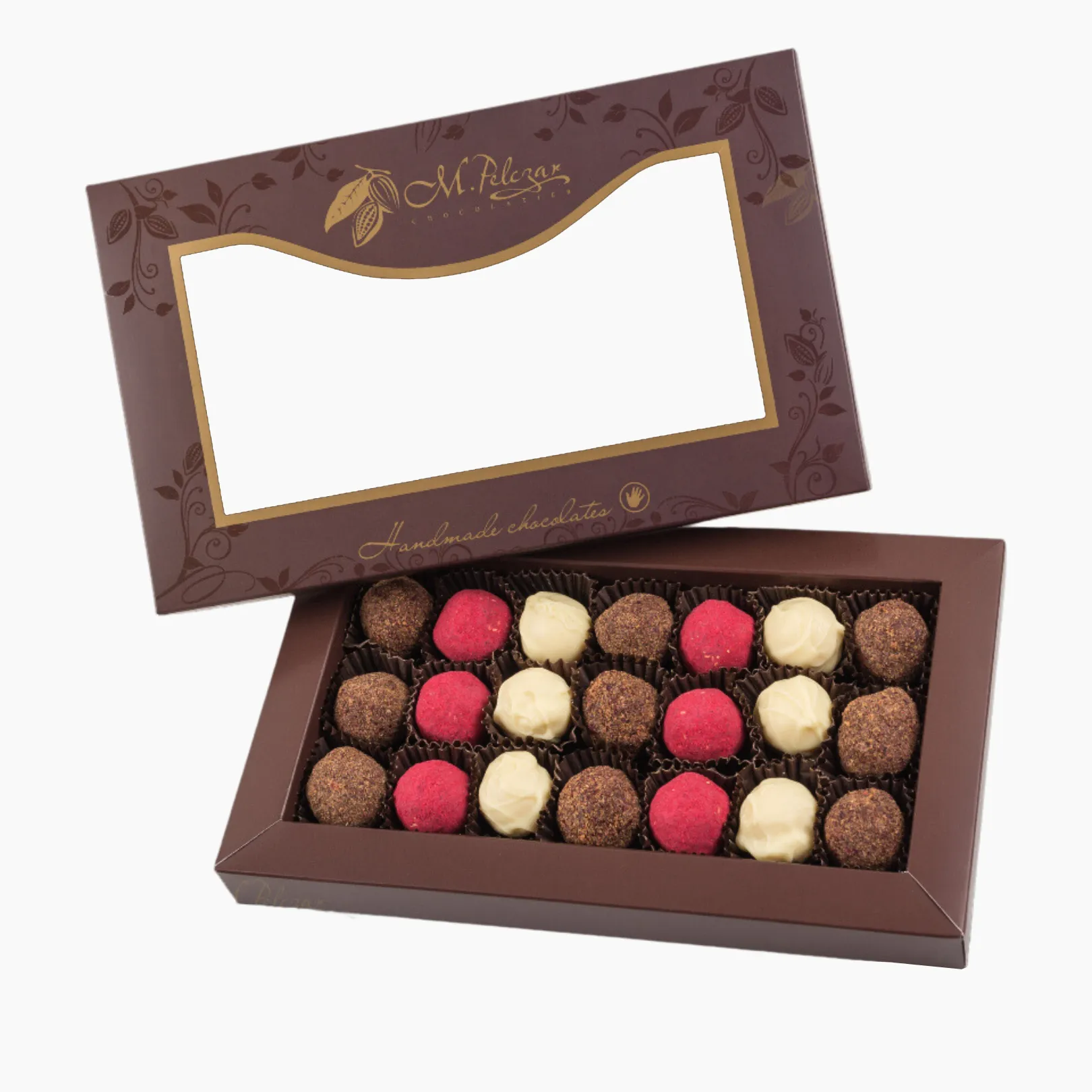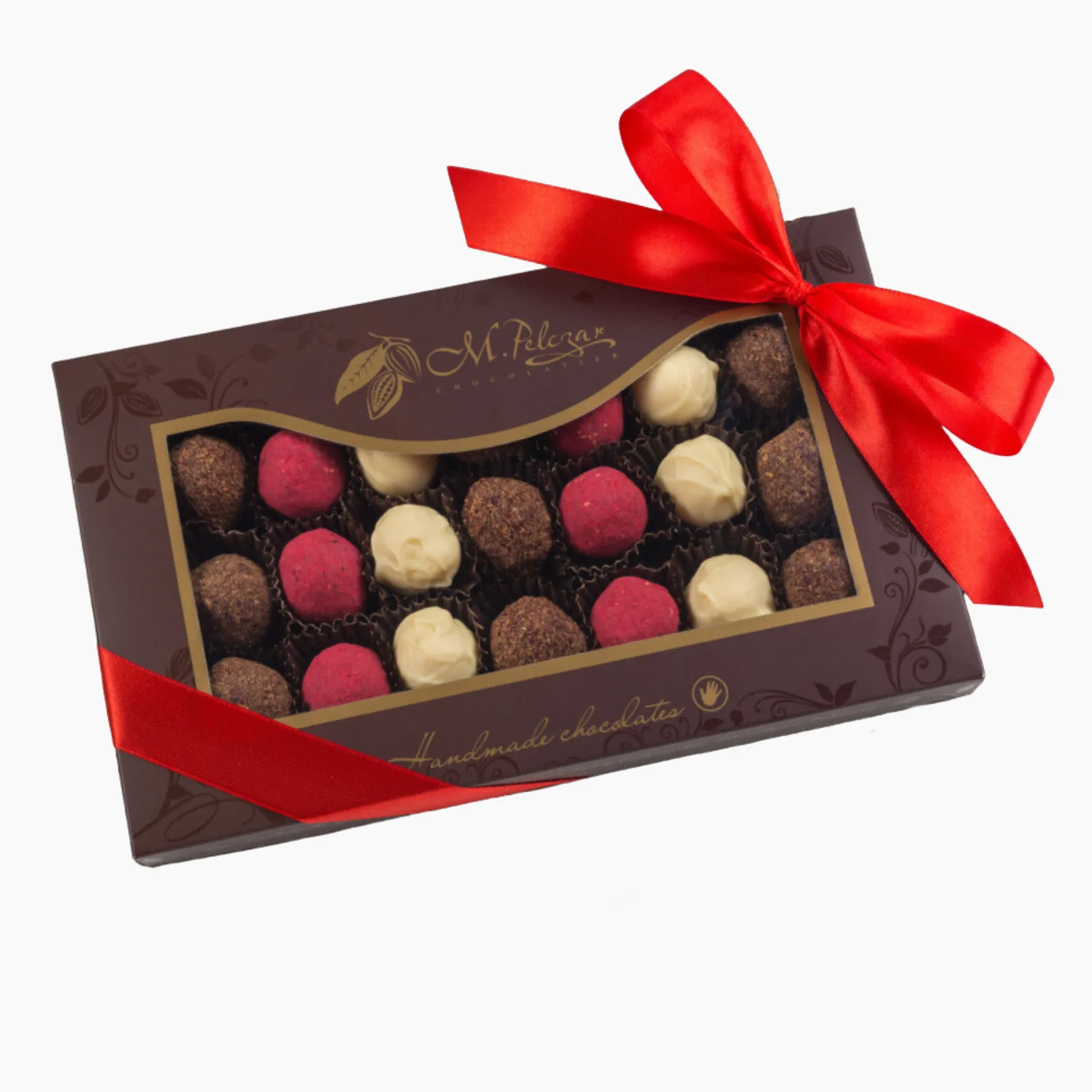 Trufle Marc de Champagne. Intensywne nadzienie o smaku markowego likieru Marc de Champagne, zamknięte w gorzkiej czekoladzie i obtoczone pudrem z maliny.