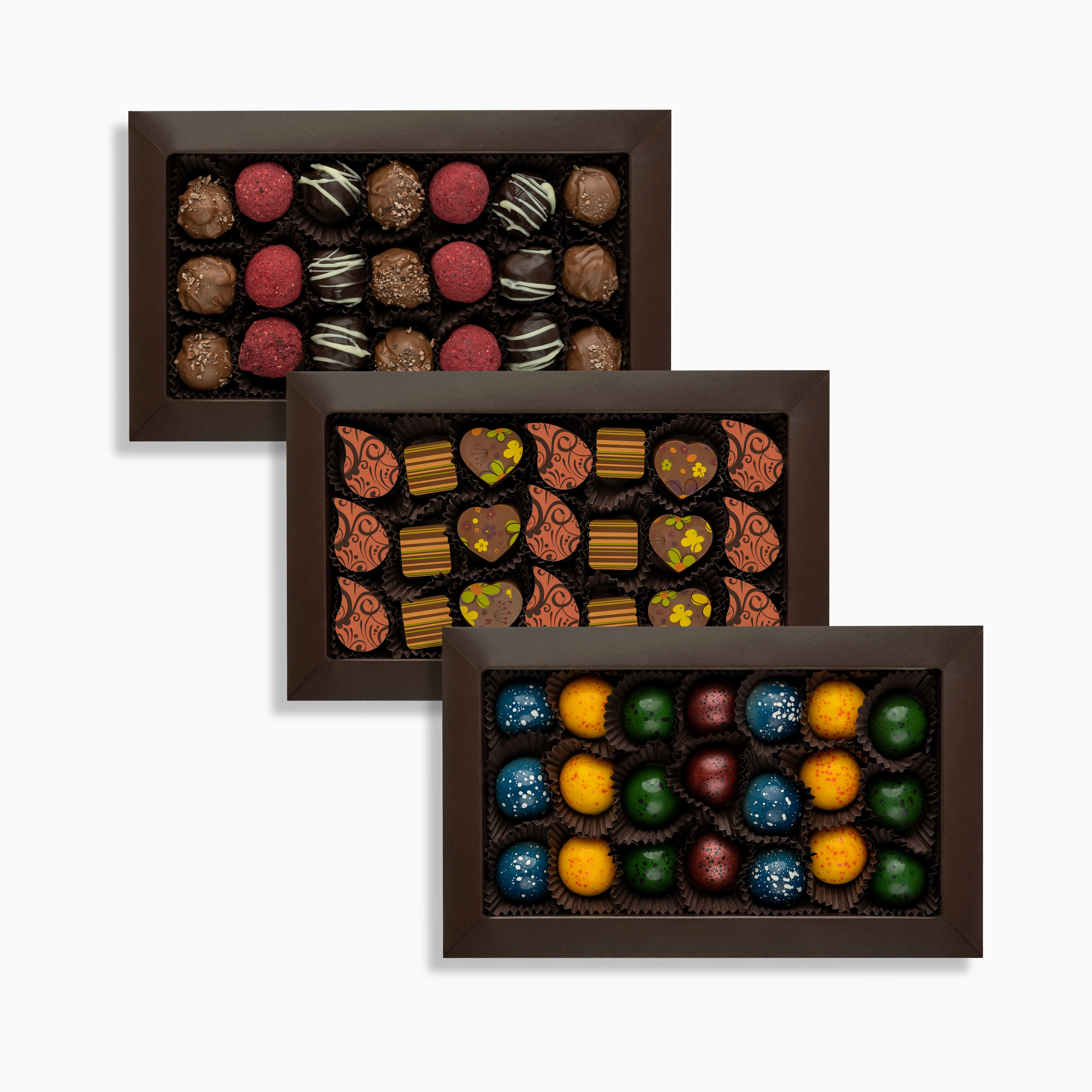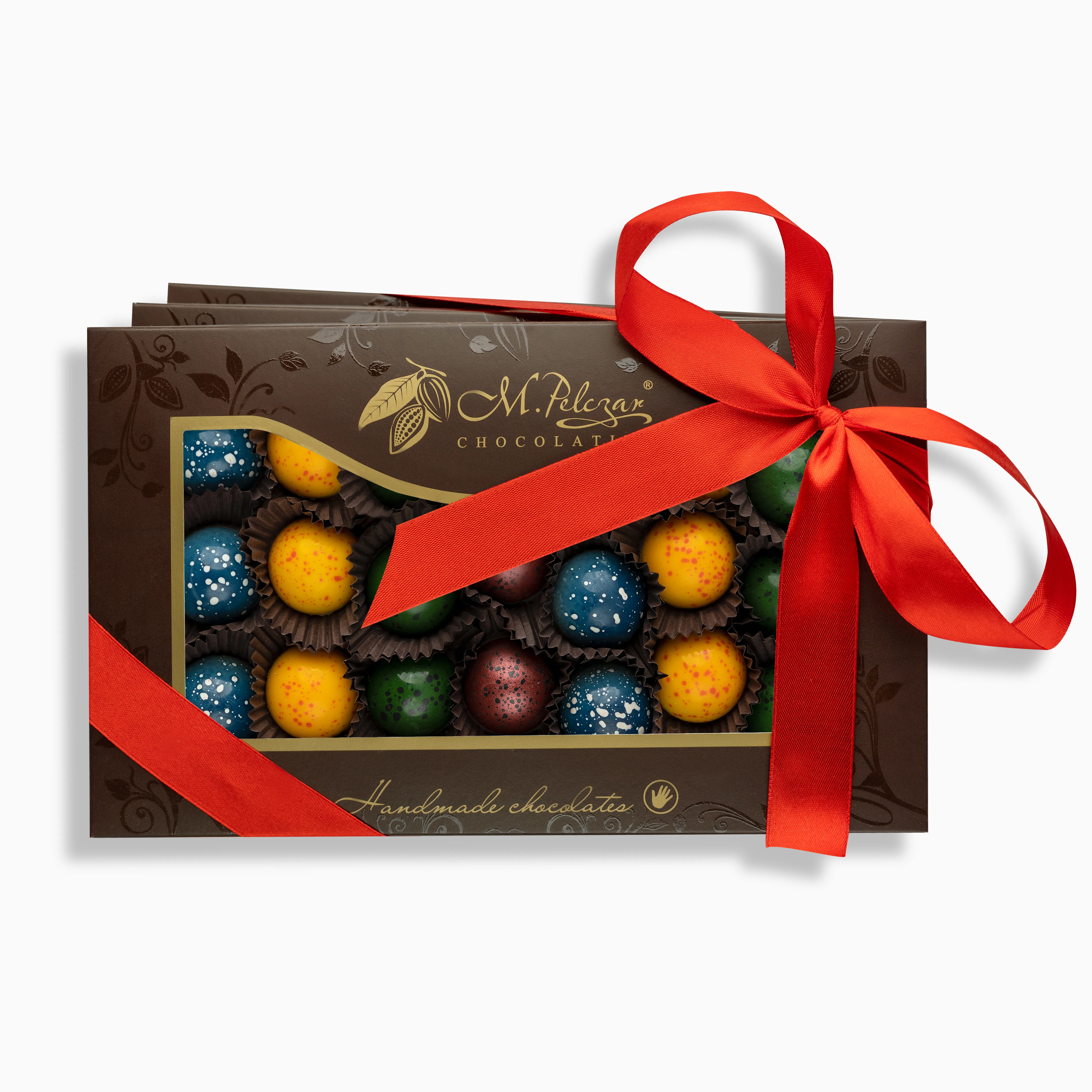 Rozsmakuj się w wyjątkowych pralinkach, i poczuj smak ręcznie robionych czekoladek. Kolekcja przygotowana przez Mistrza Polski Cukierników. Czekoladki zapakowane zostały w prestiżowe brązowe pudełka przyozdobione wstążeczką. Ukryliśmy w nim 63 ręcznie robione pralinki w różnych smakach i kształtach. Gustowny i wyjątkowo apetyczny upominek.